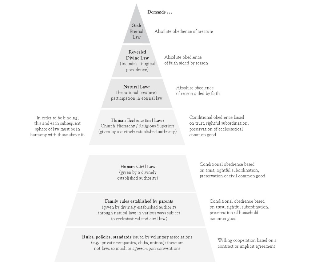 The Eternal Law, Revealed Divine Law, and the Natural Law require our obedience, and in that hierarchical order. Then comes Human Ecclesial Law (the pope and bishops).