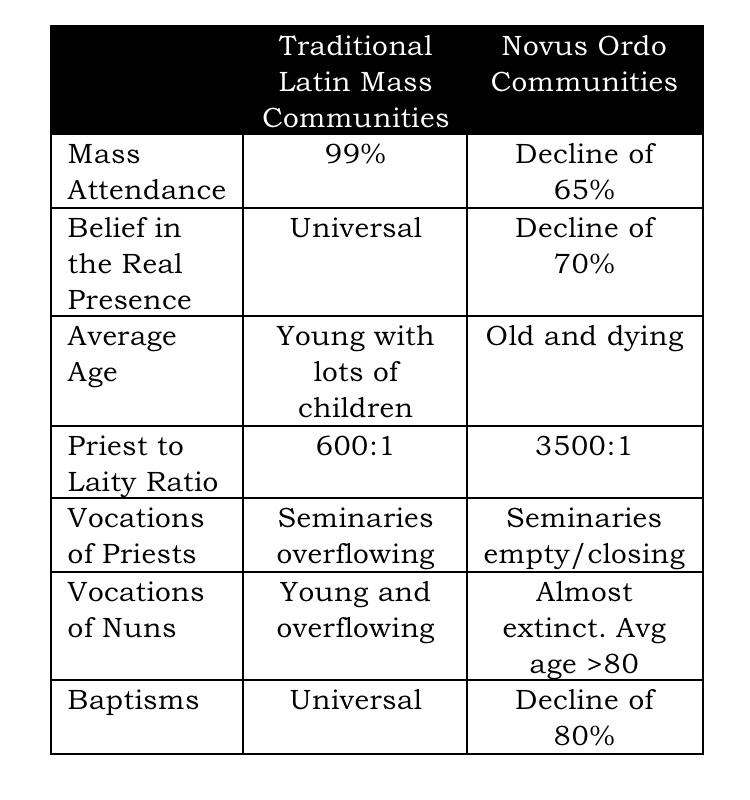 Mass Attendance: A 2019 Pew survey found that since the introduction of the Novus Ordo, the number of Americans who identify as Catholic has dropped 20 percent in the last decade alone. Prior to the Second Vatican Council 80 percent of Catholics attended Mass regularly, which has plummeted down to less than 25 percent. For parishioners at Traditional Latin Mass parishes, attendance is near 100 percent. As for the net-new converts to the Catholic faith, if you control for inflows of illegal aliens and people escaping oppressive governments (looking at you California and New York), conversions are largely coming through traditional communities.